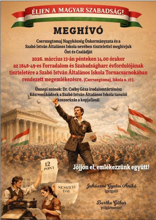 Szeretettel meghívjuk Önöket iskolánk március 15-i ünnepi megemlékezésére, ahol diákjaink műsorral tisztelegnek az 1848–49-es forradalom és szabadságharc hősei előtt.