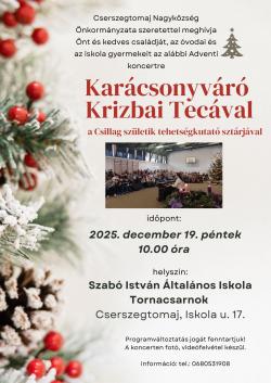 Események Krizbai Teca 2025. december 19., péntek @ 10:00 Adventi koncert Krizbai Tecával December 19., péntek 10:00 Szeretettel várunk mindenkit! Kapcsolódó galéria Krizbai Teca Megosztás