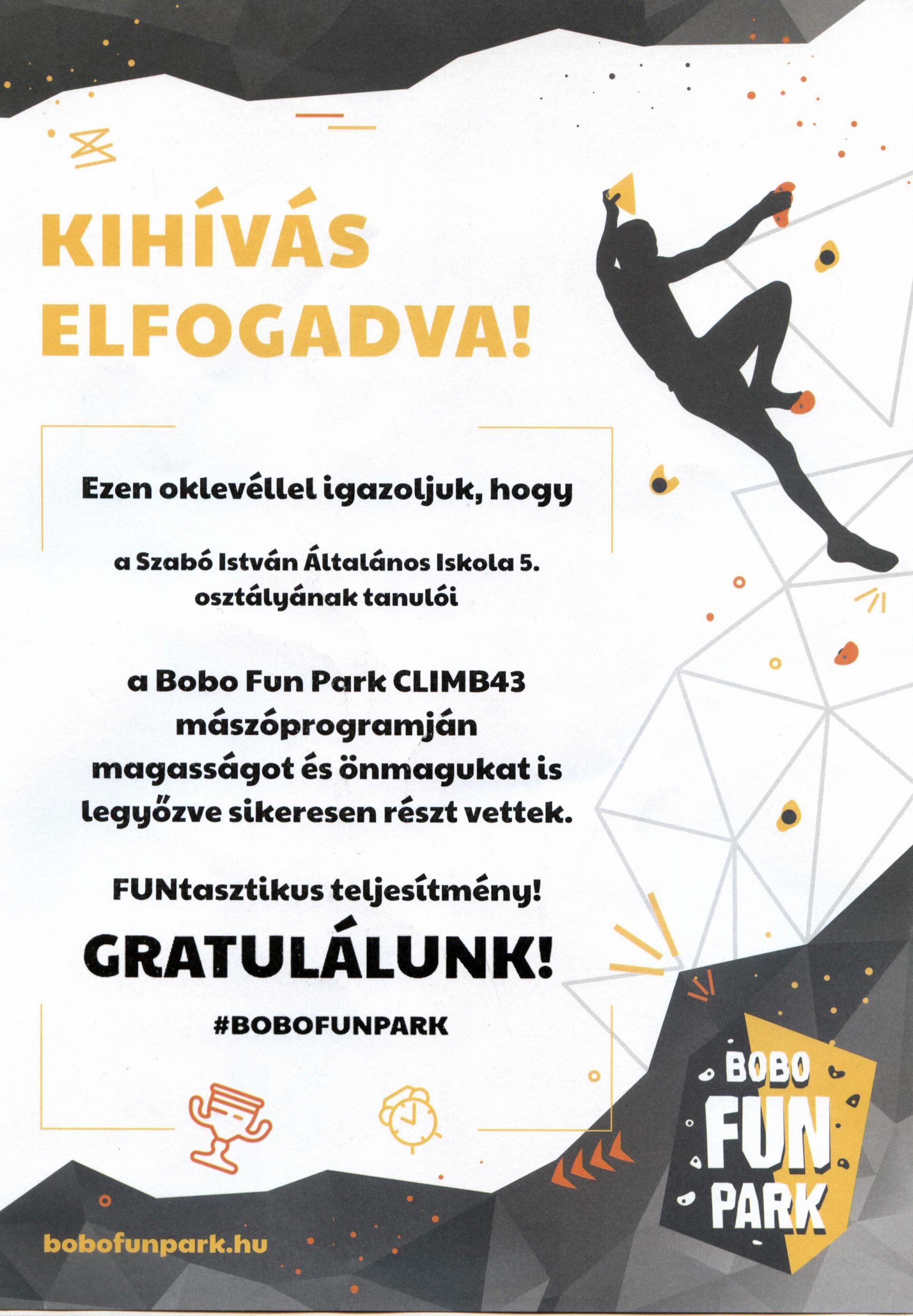 A Bobo Fun Park is csatlakozott a Sport43 Programhoz, ami ingyenes, aktív programokat biztosít általános és középiskolai osztályoknak. A program keretében a diákok rendhagyó testnevelés óra formájában 2 órás ingyenes mászás foglalkozásra jelentkezhetnek, ahol megismerkedhetnek a boulderezés és a köteles mászás alapjaival.