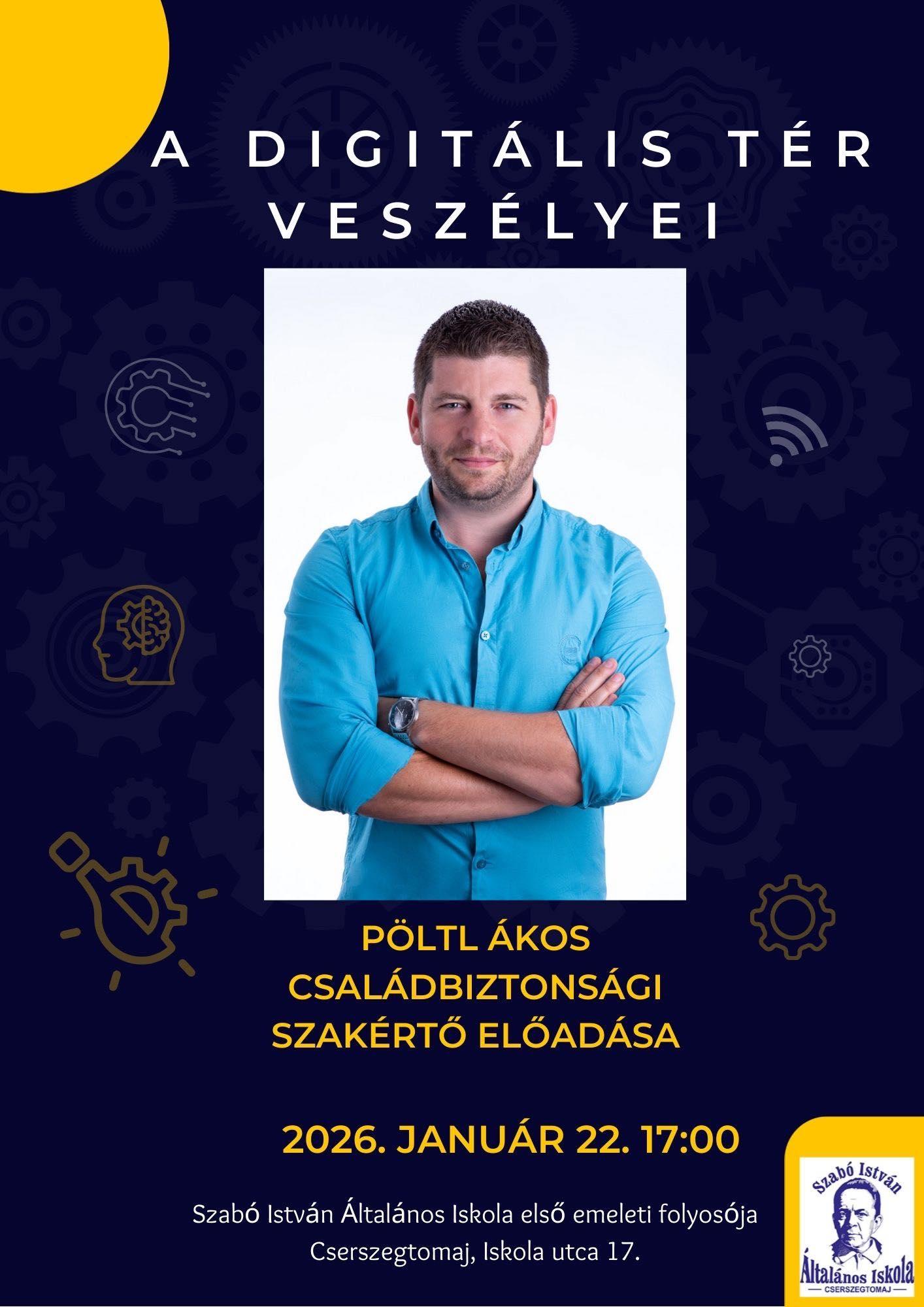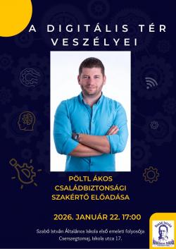Iskolánk szeretettel várja a szülőket Pöltl Ákos előadására, amely a gyermekeket érő online veszélyekre, a közösségi média hatásaira és a tudatos internethasználatra hívja fel a figyelmet.